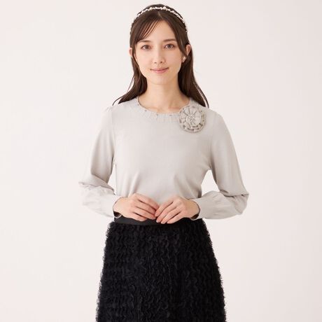 コサージュ付きプルオーバー。コサージュは同素材のニットをフリル編みにして作成しています。プルオーバーはシンプルながらも、襟元のビジュー刺しゅうでTO BE CHICらしさを表現しました。