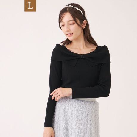 オフタートルをリボンモチーフに見立てた、甘さのあるデザインプルオーバー。中心にはビジュー刺しゅうを施し、華やかさをプラスしました。