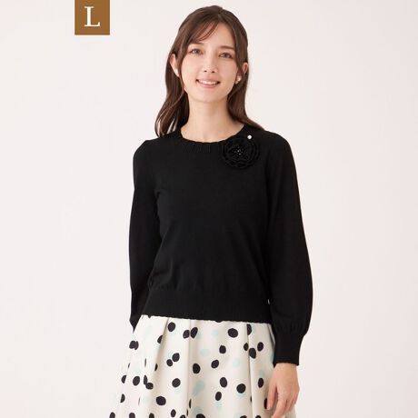 コサージュ付きプルオーバー。コサージュは同素材のニットをフリル編みにして作成しています。プルオーバーはシンプルながらも、襟元のビジュー刺しゅうでTO BE CHICらしさを表現しました。