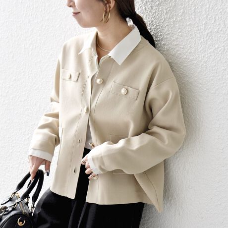 袖やポケットはジャケット仕立てにこだわりながら、カーディガンのように気軽に羽織れる一枚です。