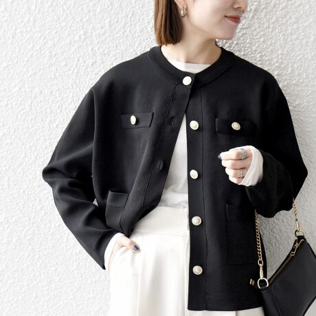 袖やポケットはジャケット仕立てにこだわりながら、カーディガンのように気軽に羽織れる一枚です。