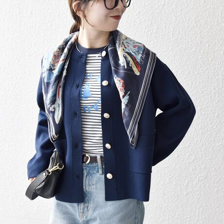 袖やポケットはジャケット仕立てにこだわりながら、カーディガンのように気軽に羽織れる一枚です。