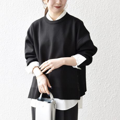 ややハリのある素材で、スウェットのようなリラックス感がありつつも上品に決まる、大人カジュアルにぴったりの一枚です。
