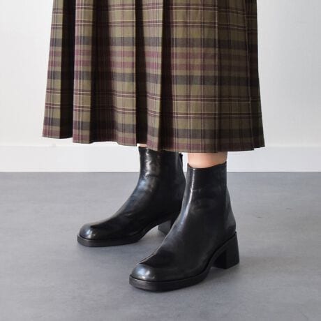 上質で大人っぽいミニマムなデザインがモードエレガンスな雰囲気のスクエアトウミドルヒールショートブーツは、着脱し易いバックジップ仕様です。