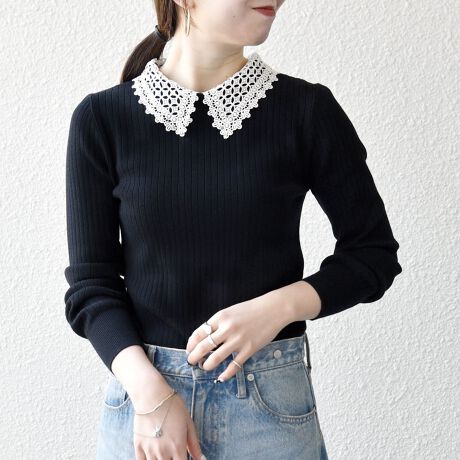 レース襟は取り外しが可能なので、ベーシックなリブニットとしてもお使いいただけます。
