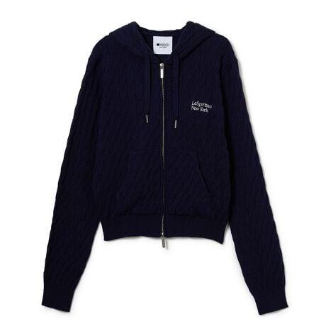 クラシックなケーブル編みが上品な印象のニットフーディー。