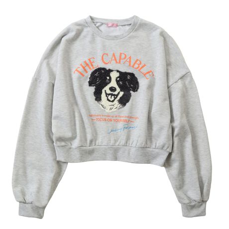 -サガラ刺?の存在感あるドッグワッペンがキュートなトレーナーです。