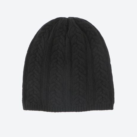 こちらは、立体感のあるケーブル編みが印象的なカシミヤニット帽です。
