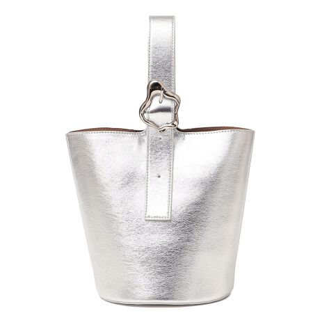 バックルのデザインが目をひくミニサイズのバケットバッグ。