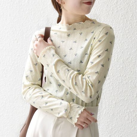 やわらかなカラーに、フラワーモチーフのプリントが施されたカットソー。