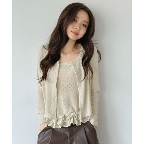 短すぎないシンプル無地のカーディガンと、裾に2段のフリルを施した