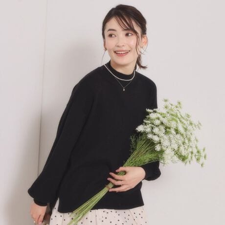総針編みで適度な肉感があり、首元までホールドしてくれるハイネックデザインなので今時期から着られて春先までお使いいただけます。