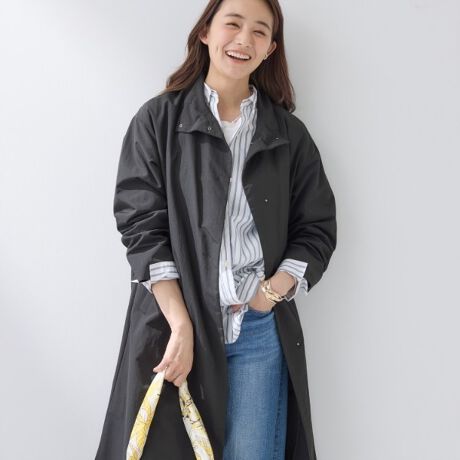 首元をすっきり見せるスタンドカラーが特徴のロングコートです。