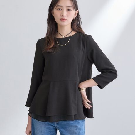 ペプラムやシフォン使いの良さを活かしながら、アシンメトリーデザインと裾からのぞくシフォンでアップデートしたブラウスです。