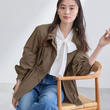 着丈を少し長めに設定しているのでヒップ周りもカバー出来、ウエストがドロスト仕様なのでトレンドのペプラム感ある女性らしいシルエットに変えて着用いただけます。