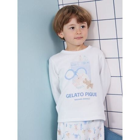 シャボンの香りが漂ってきそうな、春のピースフルなお洗濯タイム。親子でお揃いのコーディネートをお楽しみいただける、ウォッシングアニマルシリーズです。洗濯機から溢れるもこもこのぬいぐるみたちをプリントしたKIDSサイズのロングTシャツ。寒さが続く今の時期にちょうど良い、ふんわりとした肌触りのエイトロック素材を使用しました。ベーシックなシルエットでパーカやカーディガン等のインナーとしても重宝します。色は春らしい爽やかな色合いのオフホワイトとブルーをご用意。同シリーズの総柄パンツやジャガードニット、雑貨と合わせたり、LADIES’、JUNIOR、BABYサイズとのリンク・コーディネートもおすすめです。