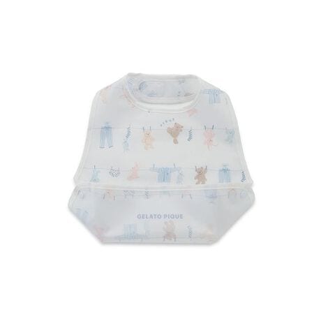 シャボンの香りが漂ってきそうな、春のピースフルなお洗濯タイム。ウォッシングアニマルのルームウェアに合わせてお楽しみいただける、BABY雑貨シリーズです。洗濯紐に留まったルームウェアやぬいぐるみたちの絵柄を、総柄プリントしたお食事スタイ。ぐるりと入った絵柄の中には、ロープをよじのぼろうとする愛らしいベアも混ざっています。汚れてもさっと拭き取れるナイロン素材で、スナップボタンを外せばフラットに折りたたんでバッグに収納も可能。フロントにワンポイントでブランドロゴも入っています。色は春らしい爽やかな色合いのオフホワイトとブルーの2色展開。同シリーズのルームウェアや雑貨と合わせたり、ギフトにもおすすめです。