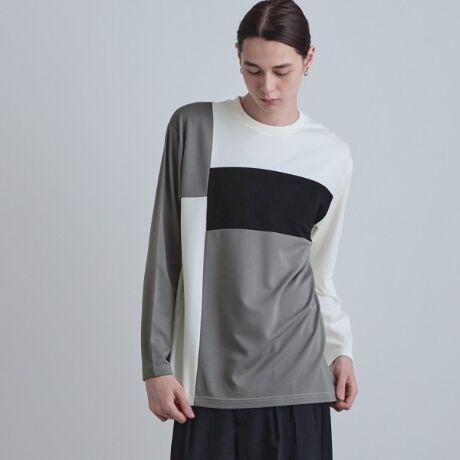 身頃と袖に大胆な切替配色をアシンメトリーに配置した、デザイン性の高いクルーネックプルオーバー。