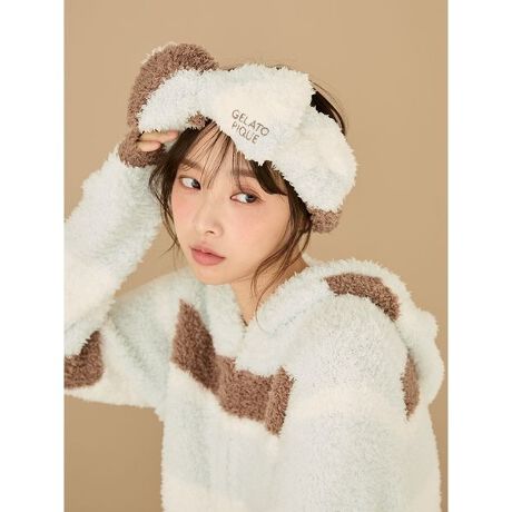 スウィートでカラフルなアイスのフレーバーをイメージした、定番‘ジェラート’素材のランダムボーダーシリーズです。ボーダーを斜めに入れ、表情豊かに仕上げたリボンデザインのヘアバンド。ワンポイントのロゴ刺繍入りで、もこもこの肌触りが癒しを届けてくれます。今季はストロベリーのような配色の柔らかなピンクと、爽やかなチョコミント味を思わせるミントの2色をご用意しました。同シリーズのウェアとコーディネートしたり、ギフトにもおすすめのアイテムです。