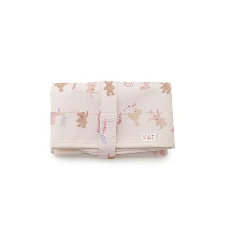 シャボンの香りが漂ってきそうな、春のピースフルなお洗濯タイム。洗濯紐に留まったルームウェアやぬいぐるみたちの絵柄を総柄プリントした、ウォッシングアニマル柄のママ雑貨シリーズです。外出先でさっと広げて使えるおむつシートは、1枚あると様々なシーンで重宝します。コンパクトに折り畳んでベルトで留められるのでバッグに入れやすく、汚れてもさっと拭き取れるのが便利です。表地のコットンは水や摩擦に強い加工を施し、裏地は抗菌防臭機能が付いた生地を使用しました。色はピンクとブルーの2色展開。同シリーズのママバッグと合わせてギフトにしたり、KIDS、BABYアイテムと合わせて持つのもおすすめです。