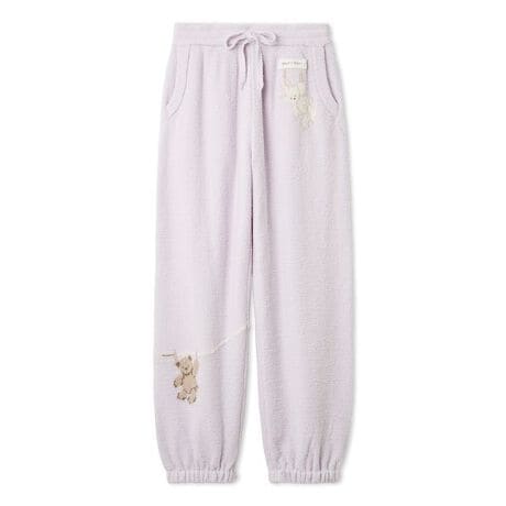 シャボンの香りが漂ってきそうな、春のピースフルなお洗濯タイム。親子でお揃いのコーディネートをお楽しみいただける、ウォッシングアニマルシリーズです。洗濯紐に留まったぬいぐるみたちの絵柄を、腰元や裾にジャガードであしらった‘エアリーモコ’素材のロングパンツ。裾にゴムを入れているので動きやすく、家事をするときにも裾のバタつきが気になりにくいシルエットです。左腰にあしらったロゴ入りのモコテープも、ふんわりとした素材感を引き立てる演出。色はベージュとラベンダーをご用意しました。同シリーズのパーカやカットソーシリーズ、ママ雑貨と合わせたり、JUNIOR、KIDS、BABYサイズとのリンク・コーディネートもおすすめです。