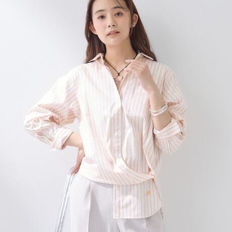 レギュラーカラーで首元はすっきりと見せ、前を重ねてカシュクールに、またはそのままシャツとしても着られる2WAYデザインです。