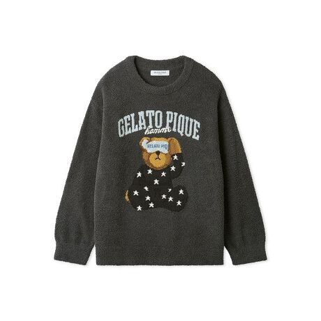ふっくら柔らかな‘ベビモコ’素材に、ベアやボーダー、スターなどのモチーフを散りばめたグッドモーニングベア柄のニットシリーズです。定番2色ボーダーやスター柄のルームウェアを着たHOMMEベアの、おやすみ&お目覚めシーンを描いたジャガードプルオーバー。アイマスクを付けたり、外したりするベアの仕草や、キャッチーなロゴデザインにもこだわりました。ゆったりしたシルエットで、毎日のリラックス時間に心地良さをお届けします。色はお目覚めシーンをイメージした明るいクリームと、おやすみ時間をイメージした夜っぽいダークグレーの2色展開。同シリーズのロングパンツを合わせてお楽しみいただけます。