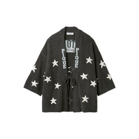 ふっくら柔らかな‘ベビモコ’素材に、ベアやボーダー、スターなどのモチーフを散りばめたグッドモーニングベア柄のニットシリーズです。昔ながらのちゃんちゃんこからインスパイアされた、毎年人気のピケチャンが今年も登場。ストレスフリーに羽織れるピケチャンならではの心地良さを、ぜひお楽しみください。色はお目覚めシーンをイメージした爽やかなミントと、おやすみ時間をイメージした夜っぽいダークグレーの2色展開。同シリーズのロングパンツや、同時期に展開するグッドモーニングベアプリントのロンTを合わせるのもおすすめです。