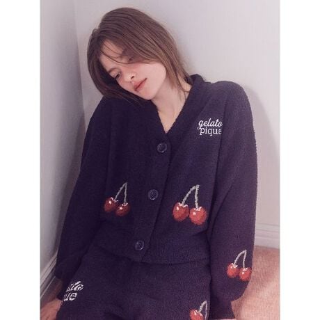 人気のチェリーモチーフを柔らかな‘ベビモコ’素材にあしらった、可愛らしい雰囲気のジャガードニットシリーズです。フロントの左右と両袖にチェリージャガードを入れたVネックのカーディガン。ややショート丈のデザインで、パンツだけでなくチェリー柄カップインワンピースに羽織ってもスタイリッシュに着こなせるアイテムです。胸元にあしらったロゴ刺繍は、「gelato」と「pique」でフォントを変えているのがポイント。色はオフホワイトとピンクに、ONLINE限定カラーのネイビーを加えた全3色をご用意しました。同シリーズのショートパンツや、同時期に展開する総柄のチェリー柄キャミワンピースとコーディネートするのがおすすめです。