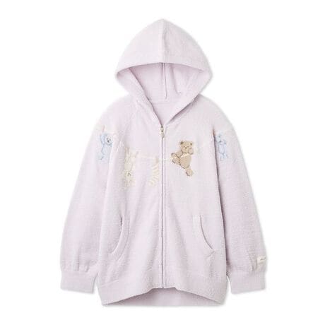 シャボンの香りが漂ってきそうな、春のピースフルなお洗濯タイム。親子でお揃いのコーディネートをお楽しみいただける、ウォッシングアニマルシリーズです。洗濯紐に留まったルームウェアやぬいぐるみたちの絵柄を、ジャガードで描いた‘エアリーモコ’素材のジップパーカ。フロントから背中までぐるりと入った絵柄の中には、ロープをよじのぼろうとする愛らしいベアも混ざっています。袖口にあしらったロゴ入りのモコテープも、ふんわりとした素材感を引き立てます。色はオフホワイトとラベンダーをご用意しました。同シリーズのロングパンツやカットソーシリーズ、ママ雑貨と合わせたり、JUNIOR、KIDS、BABYサイズとのリンク・コーディネートもおすすめです。