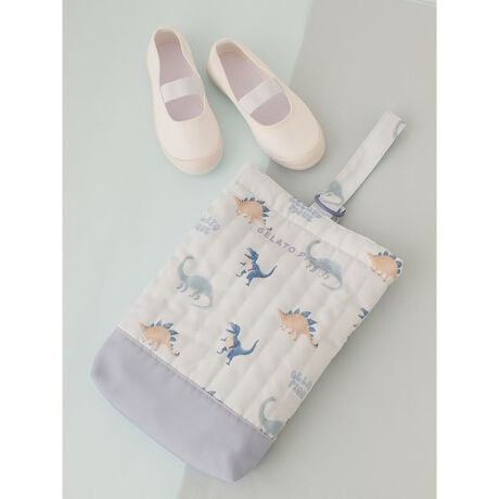 入園・入学式や新学年を迎えるKIDSのための、gelato piqueらしいキュートなバッグ&収納シリーズが装い新たに新登場。ストライプのキルト生地にカラフルな柄プリントを配した、裏地付きのシューズバッグです。上履きや運動靴などをすっきりと収納。ハンドルの根元に付いたリングが中身の飛び出しを防ぎ、底面は無地の生地で汚れが気になりにくい仕様です。撥水機能をプラスした生地を使用し、より使いやすさが向上しました。ワンポイントでブランドロゴの刺繍入り。色はいちご柄のオフホワイト、ベア柄のベージュ、リボン柄のピンク、ダイナソー柄のブルーの4色展開です。同シリーズのバッグや巾着と組み合わせてお楽しみください。