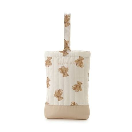 入園・入学式や新学年を迎えるKIDSのための、gelato piqueらしいキュートなバッグ&収納シリーズが装い新たに新登場。ストライプのキルト生地にカラフルな柄プリントを配した、裏地付きのシューズバッグです。上履きや運動靴などをすっきりと収納。ハンドルの根元に付いたリングが中身の飛び出しを防ぎ、底面は無地の生地で汚れが気になりにくい仕様です。撥水機能をプラスした生地を使用し、より使いやすさが向上しました。ワンポイントでブランドロゴの刺繍入り。色はいちご柄のオフホワイト、ベア柄のベージュ、リボン柄のピンク、ダイナソー柄のブルーの4色展開です。同シリーズのバッグや巾着と組み合わせてお楽しみください。