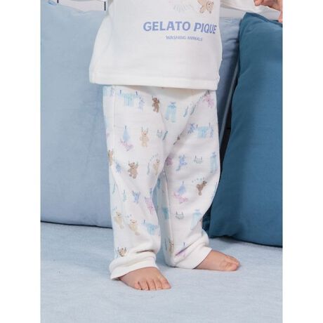 シャボンの香りが漂ってきそうな、春のピースフルなお洗濯タイム。親子でお揃いのコーディネートをお楽しみいただける、ウォッシングアニマルシリーズです。洗濯紐に留まったルームウェアやぬいぐるみたちの絵柄を、総柄プリントしたBABYサイズのロングパンツ。ぐるりと入った絵柄の中には、ロープをよじのぼろうとする愛らしいベアも混ざっています。寒さが続く今の時期にちょうど良い、ふんわりとした肌触りのエイトロック素材を使用。右ヒップにポケットを付けた動きやすいシルエットです。色は春らしい爽やかな色合いのオフホワイトとブルーを揃えました。同シリーズのワンポイントロンTやジャガードニット、雑貨と合わせてギフトにしたり、LADIES’、JUNIOR、KIDSサイズとのリンク・コーディネートもお楽しみいただけます。