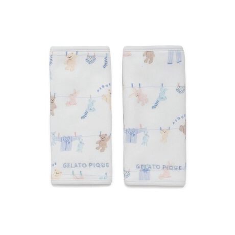 シャボンの香りが漂ってきそうな、春のピースフルなお洗濯タイム。ウォッシングアニマルのルームウェアに合わせてお楽しみいただける、BABY雑貨シリーズです。洗濯紐に留まったルームウェアやぬいぐるみたちの絵柄を、総柄プリントしたサッキングパッド。ぐるりと入った絵柄の中には、ロープをよじのぼろうとする愛らしいベアも混ざっています。ふんわりとした肌触りのエイトロック素材で、抱っこ紐やチャイルドシート、ベビーカーなどに付けてご使用が可能。ワンポイントでブランドロゴも添えました。色は春らしい爽やかな色合いのオフホワイトとブルーの2色展開。同シリーズのルームウェアや雑貨と合わせたり、ギフトにもおすすめです。
