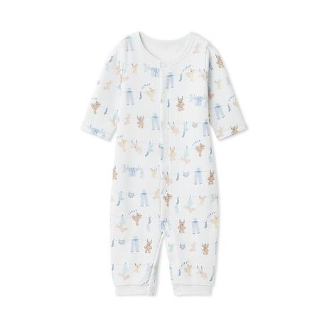 シャボンの香りが漂ってきそうな、春のピースフルなお洗濯タイム。親子でお揃いのコーディネートをお楽しみいただける、ウォッシングアニマルシリーズです。洗濯紐に留まったルームウェアやぬいぐるみたちの絵柄を、総柄プリントしたキュートな2WAYオール。ぐるりと入った絵柄の中には、ロープをよじのぼろうとする愛らしいベアも混ざっています。寒さが続く今の時期にちょうど良い、ふんわりとした肌触りのエイトロック素材を使用。お子様の成長に合わせ、パンツとドレススタイルの2通りで着用していただけます。色は春らしい爽やかな色合いのオフホワイトとブルーを揃えました。同シリーズのジャガードポンチョや雑貨と合わせてギフトにしたり、LADIES’、JUNIOR、KIDSサイズとのリンク・コーディネートもお楽しみいただけます。