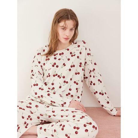 こっくりとした色合いのチェリーが大人可愛い総柄プリントのカットソーシリーズです。まだまだ寒さが続く時期にうれしい、吸湿発熱素材ののカットソーを使用したロングTシャツ。裾にかけてフレアをかけたシルエットは、リラックス感と体型カバー効果を兼ねる優れもの。色はシンプルなオフホワイトと淡いピンクをご用意しました。同シリーズのロングパンツに合わせたり、同時期のチェリージャガード入りニットシリーズとのコーディネートもお楽しみください。