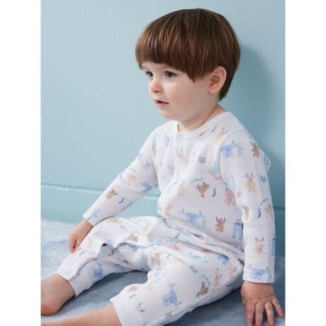 シャボンの香りが漂ってきそうな、春のピースフルなお洗濯タイム。親子でお揃いのコーディネートをお楽しみいただける、ウォッシングアニマルシリーズです。洗濯紐に留まったルームウェアやぬいぐるみたちの絵柄を、総柄プリントしたキュートなBABYロンパース。ぐるりと入った絵柄の中には、ロープをよじのぼろうとする愛らしいベアも混ざっています。寒さが続く今の時期にちょうど良い、ふんわりとした肌触りのエイトロック素材を使用。肌寒いときには羽織りをプラスするのもおすすめです。色は春らしい爽やかな色合いのオフホワイトとブルーを揃えました。同シリーズのジャガードポンチョや雑貨と合わせてギフトにしたり、LADIES’、JUNIOR、KIDSサイズとのリンク・コーディネートもお楽しみいただけます。