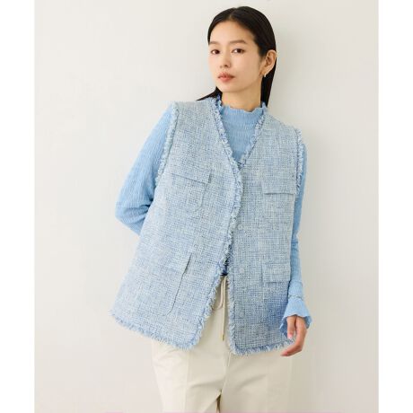 ツイード素材のフリンジが華やかなVネックジレ。閉めても開けても決まるシルエットで休日使いからお仕事・セレモニーなど、様々なシーンで着回しが可能です。