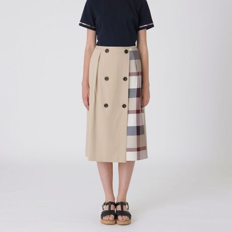 [型番:56S01607__]◆クレストブリッジチェック切替がポイントのスカート無地×クレストブリッジチェックのコンビネーションがトレンド感のあるラップ風のスカートです。フロントに付いた丸くレトロな大きめボタンがブルーレーベルらしいアクセントになっています。※展開店舗については、予告なく変更になる場合がございます。