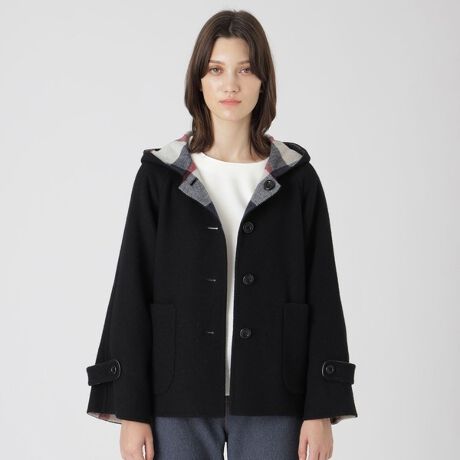 [型番:56B02604__]◆リバーシブルで使えるショートコート後ろ下がりシルエットがポイントのフード付きリバーシブルコートです。ケープの様な裾広がりなAラインシルエットが特徴です。リバーシブルなのでその日の気分で無地とチェック柄を選べます。袖口タブは取り外し可能なので、ご自身でカスタマイズを楽しめます。