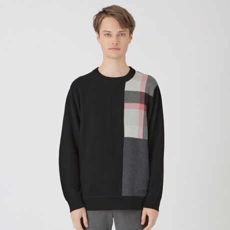【パッチワーク状にあしらったチェックが目を引くクルーネックニット】
