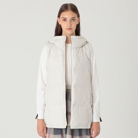 [型番:56C01603__]◆秋口から活躍するダウンベスト上品でしなやかなタフタ素材を使用した柔らかく軽いダウンベストです。ヒップが隠れる長めの丈感で、ほんのりAラインになったシルエットは裾をゴムスピンドルで絞りコクーンシルエットにすることも可能です。ゴールドのジップとプルトップがブランドらしいポイントです。【Fabric】はっ水加工を施した素材です。