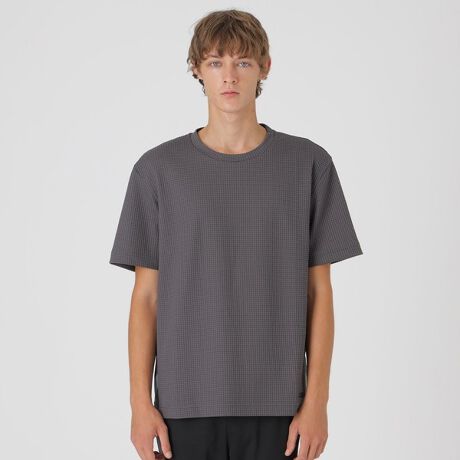 素材にはポリエステルのタック柄生地を採用。特殊な編み柄で凹凸感ある見映えが特徴です。表面感ある見た目でTシャツながら存在感ある一着に仕上げています。