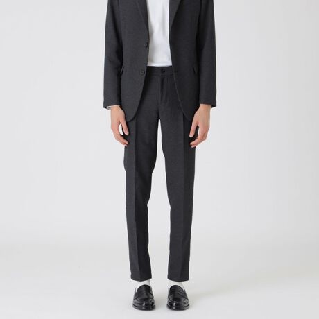 メランジカラーのダブルフェイス素材を使用したトラウザーズ。シャープな印象を持たせる細身のシルエットながらも、ウエスト部分にはゴムシャーリングを施し快適な履き心地。カジュアルからビジネスまで幅広く活躍するベーシックなデザインです。