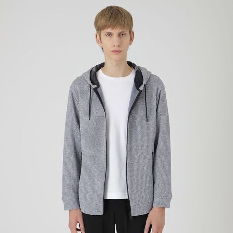 ニットの様な表面感と柔らかさを持ったジップアップパーカー。素材の膨らみ感により程良い厚みがあり、アウター感覚で長い期間着用できるパーカーです。ファスナーやドローコードを黒でまとめることでシャープなテイストに仕上げています。