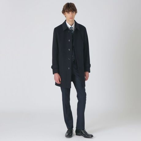[型番:51B63664__]【汎用性の高いシンプルなデザインのステンカラーウールコート】ビジネスシーンからカジュアルな合わせまで、オンオフ問わず幅広くコーディネート可能なステンカラーコート。ブランドロゴを刻印したオリジナル釦や、アイコニックなクレストブリッジチェック裏地を背裏部分に使用した付加価値の高い1着です。滑らかな風合いと、美しい表面感のウールビーバー素材を使用しています。ポリエステルをブレンドする事で軽量な素材に仕上げています。
