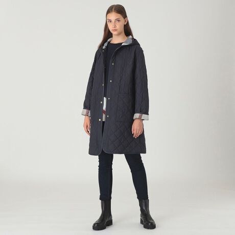 [型番:56A01602__]◆軽くて着心地のよいキルティングコート薄い中綿の入ったフード付きキルティングコートです。袖口をターンバックさせるとチェック柄がのぞきます。身巾もゆったりとしているので、厚手のニットとも相性抜群です。