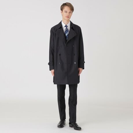 【ポリエステル混のギャバジン素材を使用したダブルブレステッドトレンチコート】