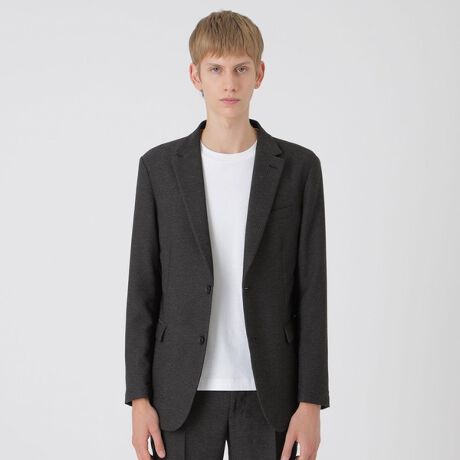 メランジカラーのダブルフェイス素材を使用したアンコン仕様ジャケット。肩パッド等を極力使用しないことで、軽さと快適な着心地を追求しました。
