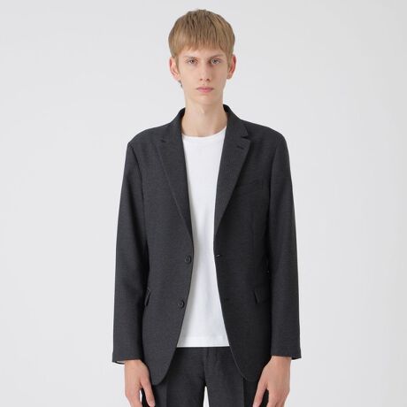 メランジカラーのダブルフェイス素材を使用したアンコン仕様ジャケット。肩パッド等を極力使用しないことで、軽さと快適な着心地を追求しました。